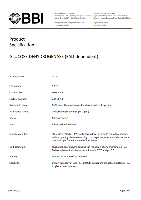 Glucose Dehydrogenase (FAD-dependent) – Product Specification